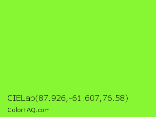 CIELab 87.926,-61.607,76.58 Color is a normal green color and the nearest color is Spring Frost #87ff2a. Hex code #87f733 and RGB value is rgb(135,247,51). In RGB color space, this color is composed of 53% red, 97% green, 20% blue, In CMYK color space, this color is composed of 45% cyan, 0% magenta, 79% yellow , 3% black , In HSL color space, this color has a hue angle of 94° , 92% saturation and 58% lightness.