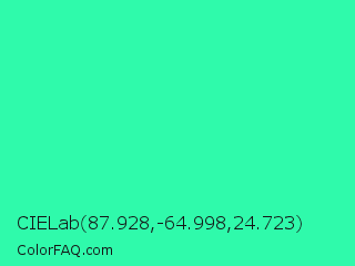 CIELab 87.928,-64.998,24.723 Color is a normal green color and the nearest color is Eucalyptus #44d7a8. Hex code #2ffaab and RGB value is rgb(47,250,171). In RGB color space, this color is composed of 18% red, 98% green, 67% blue, In CMYK color space, this color is composed of 81% cyan, 0% magenta, 32% yellow , 2% black , In HSL color space, this color has a hue angle of 157° , 95% saturation and 58% lightness.