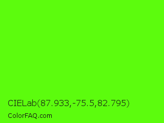 CIELab 87.933,-75.5,82.795 Color is a normal green color and the nearest color is Bright Green #66ff00. Hex code #5cfc0d and RGB value is rgb(92,252,13). In RGB color space, this color is composed of 36% red, 99% green, 5% blue, In CMYK color space, this color is composed of 63% cyan, 0% magenta, 95% yellow , 1% black , In HSL color space, this color has a hue angle of 100° , 98% saturation and 52% lightness.