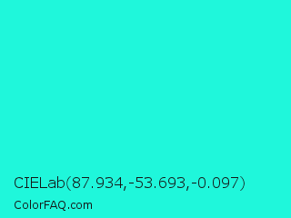CIELab 87.934,-53.693,-0.097 Color is a normal cyan color and the nearest color is Bright Turquoise #08e8de. Hex code #1ff7db and RGB value is rgb(31,247,219). In RGB color space, this color is composed of 12% red, 97% green, 86% blue, In CMYK color space, this color is composed of 87% cyan, 0% magenta, 11% yellow , 3% black , In HSL color space, this color has a hue angle of 172° , 93% saturation and 55% lightness.