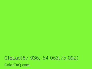 CIELab 87.936,-64.063,75.092 Color is a normal green color and the nearest color is Spring Frost #87ff2a. Hex code #7ff838 and RGB value is rgb(127,248,56). In RGB color space, this color is composed of 50% red, 97% green, 22% blue, In CMYK color space, this color is composed of 49% cyan, 0% magenta, 77% yellow , 3% black , In HSL color space, this color has a hue angle of 98° , 93% saturation and 60% lightness.