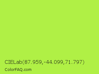 CIELab 87.959,-44.099,71.797 Color is a light green color and the nearest color is Conifer #acdd4d. Hex code #b0f045 and RGB value is rgb(176,240,69). In RGB color space, this color is composed of 69% red, 94% green, 27% blue, In CMYK color space, this color is composed of 27% cyan, 0% magenta, 71% yellow , 6% black , In HSL color space, this color has a hue angle of 82° , 85% saturation and 61% lightness.