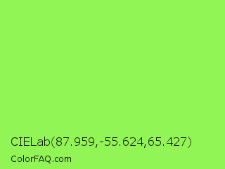 CIELab 87.959,-55.624,65.427 Color is a light green color and the nearest color is Kiwi #8ee53f. Hex code #91f555 and RGB value is rgb(145,245,85). In RGB color space, this color is composed of 57% red, 96% green, 33% blue, In CMYK color space, this color is composed of 41% cyan, 0% magenta, 65% yellow , 4% black , In HSL color space, this color has a hue angle of 98° , 89% saturation and 65% lightness.