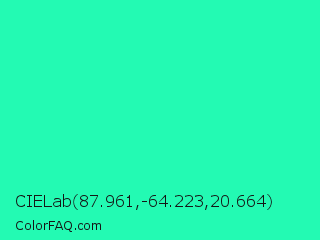 CIELab 87.961,-64.223,20.664 Color is a normal green color and the nearest color is Medium Spring Green #00fa9a. Hex code #23fab3 and RGB value is rgb(35,250,179). In RGB color space, this color is composed of 14% red, 98% green, 70% blue, In CMYK color space, this color is composed of 86% cyan, 0% magenta, 28% yellow , 2% black , In HSL color space, this color has a hue angle of 160° , 96% saturation and 56% lightness.