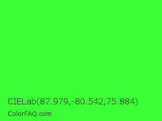 CIELab 87.979,-80.542,75.884 Color is a normal green color and the nearest color is Neon Green #39ff14. Hex code #3afe33 and RGB value is rgb(58,254,51). In RGB color space, this color is composed of 23% red, 100% green, 20% blue, In CMYK color space, this color is composed of 77% cyan, 0% magenta, 80% yellow , 0% black , In HSL color space, this color has a hue angle of 118° , 99% saturation and 60% lightness.