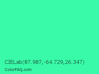 CIELab 87.987,-64.729,26.347 Color is a normal green color and the nearest color is Eucalyptus #44d7a8. Hex code #38faa8 and RGB value is rgb(56,250,168). In RGB color space, this color is composed of 22% red, 98% green, 66% blue, In CMYK color space, this color is composed of 78% cyan, 0% magenta, 33% yellow , 2% black , In HSL color space, this color has a hue angle of 155° , 95% saturation and 60% lightness.