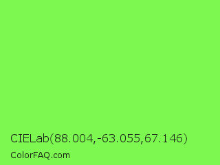 CIELab 88.004,-63.055,67.146 Color is a light green color and the nearest color is Kiwi #8ee53f. Hex code #7df850 and RGB value is rgb(125,248,80). In RGB color space, this color is composed of 49% red, 97% green, 31% blue, In CMYK color space, this color is composed of 50% cyan, 0% magenta, 68% yellow , 3% black , In HSL color space, this color has a hue angle of 104° , 92% saturation and 64% lightness.