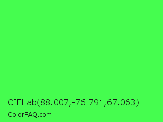 CIELab 88.007,-76.791,67.063 Color is a light green color and the nearest color is Screamin Green #66ff66. Hex code #45fd4f and RGB value is rgb(69,253,79). In RGB color space, this color is composed of 27% red, 99% green, 31% blue, In CMYK color space, this color is composed of 73% cyan, 0% magenta, 69% yellow , 1% black , In HSL color space, this color has a hue angle of 123° , 98% saturation and 63% lightness.