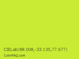 CIELab 88.008,-33.135,77.677 Color is a normal lime color and the nearest color is Pear #d1e231. Hex code #c9eb34 and RGB value is rgb(201,235,52). In RGB color space, this color is composed of 79% red, 92% green, 20% blue, In CMYK color space, this color is composed of 14% cyan, 0% magenta, 78% yellow , 8% black , In HSL color space, this color has a hue angle of 71° , 82% saturation and 56% lightness.