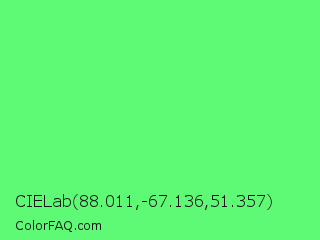 CIELab 88.011,-67.136,51.357 Color is a light green color and the nearest color is Screamin Green #66ff66. Hex code #5ffa75 and RGB value is rgb(95,250,117). In RGB color space, this color is composed of 37% red, 98% green, 46% blue, In CMYK color space, this color is composed of 62% cyan, 0% magenta, 53% yellow , 2% black , In HSL color space, this color has a hue angle of 129° , 94% saturation and 68% lightness.