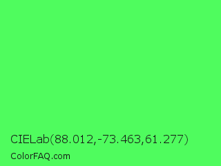 CIELab 88.012,-73.463,61.277 Color is a light green color and the nearest color is Screamin Green #66ff66. Hex code #4ffc5e and RGB value is rgb(79,252,94). In RGB color space, this color is composed of 31% red, 99% green, 37% blue, In CMYK color space, this color is composed of 69% cyan, 0% magenta, 63% yellow , 1% black , In HSL color space, this color has a hue angle of 125° , 97% saturation and 65% lightness.