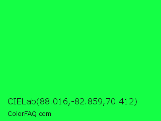 CIELab 88.016,-82.859,70.412 Color is a normal green color and the nearest color is Malachite #0bda51. Hex code #14ff45 and RGB value is rgb(20,255,69). In RGB color space, this color is composed of 8% red, 100% green, 27% blue, In CMYK color space, this color is composed of 92% cyan, 0% magenta, 73% yellow , 0% black , In HSL color space, this color has a hue angle of 133° , 100% saturation and 54% lightness.