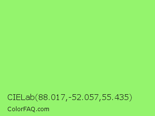 CIELab 88.017,-52.057,55.435 Color is a light green color and the nearest color is Inchworm #b2ec5d. Hex code #94f46d and RGB value is rgb(148,244,109). In RGB color space, this color is composed of 58% red, 96% green, 43% blue, In CMYK color space, this color is composed of 39% cyan, 0% magenta, 55% yellow , 4% black , In HSL color space, this color has a hue angle of 103° , 86% saturation and 69% lightness.