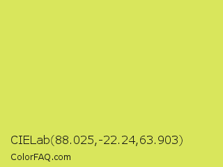 CIELab 88.025,-22.24,63.903 Color is a light yellow color and the nearest color is Maximum Green Yellow #d9e650. Hex code #d9e65c and RGB value is rgb(217,230,92). In RGB color space, this color is composed of 85% red, 90% green, 36% blue, In CMYK color space, this color is composed of 6% cyan, 0% magenta, 60% yellow , 10% black , In HSL color space, this color has a hue angle of 66° , 73% saturation and 63% lightness.