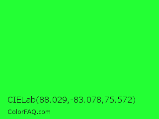 CIELab 88.029,-83.078,75.572 Color is a normal green color and the nearest color is Neon Green #39ff14. Hex code #23ff34 and RGB value is rgb(35,255,52). In RGB color space, this color is composed of 14% red, 100% green, 20% blue, In CMYK color space, this color is composed of 86% cyan, 0% magenta, 80% yellow , 0% black , In HSL color space, this color has a hue angle of 125° , 100% saturation and 57% lightness.