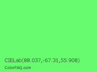 CIELab 88.037,-67.31,55.908 Color is a light green color and the nearest color is Screamin Green #66ff66. Hex code #64fa6b and RGB value is rgb(100,250,107). In RGB color space, this color is composed of 39% red, 98% green, 42% blue, In CMYK color space, this color is composed of 60% cyan, 0% magenta, 57% yellow , 2% black , In HSL color space, this color has a hue angle of 123° , 94% saturation and 69% lightness.