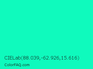 CIELab 88.039,-62.926,15.616 Color is a normal cyan color and the nearest color is Medium Spring Green #00fa9a. Hex code #0ffabd and RGB value is rgb(15,250,189). In RGB color space, this color is composed of 6% red, 98% green, 74% blue, In CMYK color space, this color is composed of 94% cyan, 0% magenta, 24% yellow , 2% black , In HSL color space, this color has a hue angle of 164° , 96% saturation and 52% lightness.