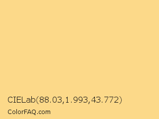 CIELab 88.03,1.993,43.772 Color is a light orange color and the nearest color is Salomie #fedb8d. Hex code #fcd989 and RGB value is rgb(252,217,137). In RGB color space, this color is composed of 99% red, 85% green, 54% blue, In CMYK color space, this color is composed of 0% cyan, 14% magenta, 46% yellow , 1% black , In HSL color space, this color has a hue angle of 42° , 95% saturation and 76% lightness.