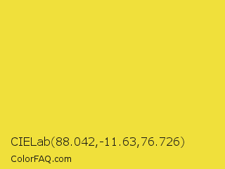 CIELab 88.042,-11.63,76.726 Color is a normal yellow color and the nearest color is Dandelion #f0e130. Hex code #f0e03b and RGB value is rgb(240,224,59). In RGB color space, this color is composed of 94% red, 88% green, 23% blue, In CMYK color space, this color is composed of 0% cyan, 7% magenta, 75% yellow , 6% black , In HSL color space, this color has a hue angle of 55° , 86% saturation and 59% lightness.