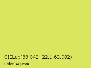 CIELab 88.042,-22.1,63.082 Color is a light yellow color and the nearest color is Booger Buster #dde26a. Hex code #d9e65e and RGB value is rgb(217,230,94). In RGB color space, this color is composed of 85% red, 90% green, 37% blue, In CMYK color space, this color is composed of 6% cyan, 0% magenta, 59% yellow , 10% black , In HSL color space, this color has a hue angle of 66° , 73% saturation and 64% lightness.