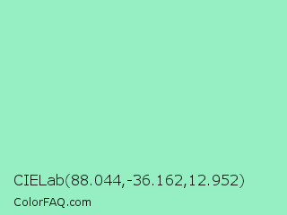 CIELab 88.044,-36.162,12.952 Color is a light green color and the nearest color is Sea Foam Green #9fe2bf. Hex code #96efc3 and RGB value is rgb(150,239,195). In RGB color space, this color is composed of 59% red, 94% green, 76% blue, In CMYK color space, this color is composed of 37% cyan, 0% magenta, 18% yellow , 6% black , In HSL color space, this color has a hue angle of 150° , 74% saturation and 76% lightness.