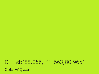 CIELab 88.056,-41.663,80.965 Color is a normal lime color and the nearest color is Green Yellow #adff2f. Hex code #b9ef25 and RGB value is rgb(185,239,37). In RGB color space, this color is composed of 73% red, 94% green, 15% blue, In CMYK color space, this color is composed of 23% cyan, 0% magenta, 85% yellow , 6% black , In HSL color space, this color has a hue angle of 76° , 86% saturation and 54% lightness.