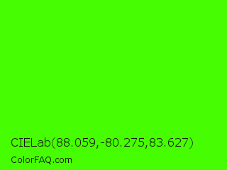 CIELab 88.059,-80.275,83.627 Color is a normal green color and the nearest color is Chlorophyll Green #4aff00. Hex code #46fe01 and RGB value is rgb(70,254,1). In RGB color space, this color is composed of 27% red, 100% green, 0% blue, In CMYK color space, this color is composed of 72% cyan, 0% magenta, 100% yellow , 0% black , In HSL color space, this color has a hue angle of 104° , 99% saturation and 50% lightness.