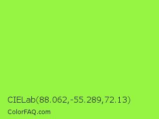 CIELab 88.062,-55.289,72.13 Color is a light green color and the nearest color is French Lime #9efd38. Hex code #96f543 and RGB value is rgb(150,245,67). In RGB color space, this color is composed of 59% red, 96% green, 26% blue, In CMYK color space, this color is composed of 39% cyan, 0% magenta, 73% yellow , 4% black , In HSL color space, this color has a hue angle of 92° , 90% saturation and 61% lightness.