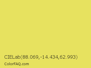 CIELab 88.069,-14.434,62.993 Color is a light yellow color and the nearest color is Confetti #e9d75a. Hex code #e7e25f and RGB value is rgb(231,226,95). In RGB color space, this color is composed of 91% red, 89% green, 37% blue, In CMYK color space, this color is composed of 0% cyan, 2% magenta, 59% yellow , 9% black , In HSL color space, this color has a hue angle of 58° , 74% saturation and 64% lightness.
