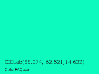 CIELab 88.074,-62.521,14.632 Color is a normal cyan color and the nearest color is Bright Turquoise #08e8de. Hex code #0dfabf and RGB value is rgb(13,250,191). In RGB color space, this color is composed of 5% red, 98% green, 75% blue, In CMYK color space, this color is composed of 95% cyan, 0% magenta, 24% yellow , 2% black , In HSL color space, this color has a hue angle of 165° , 96% saturation and 52% lightness.