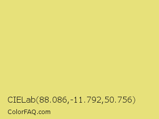 CIELab 88.086,-11.792,50.756 Color is a light yellow color and the nearest color is Golden Sand #f0db7d. Hex code #e7e17a and RGB value is rgb(231,225,122). In RGB color space, this color is composed of 91% red, 88% green, 48% blue, In CMYK color space, this color is composed of 0% cyan, 3% magenta, 47% yellow , 9% black , In HSL color space, this color has a hue angle of 57° , 69% saturation and 69% lightness.