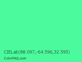 CIELab 88.097,-64.596,32.595 Color is a light green color and the nearest color is Very Light Malachite Green #64e986. Hex code #4bfa9c and RGB value is rgb(75,250,156). In RGB color space, this color is composed of 29% red, 98% green, 61% blue, In CMYK color space, this color is composed of 70% cyan, 0% magenta, 38% yellow , 2% black , In HSL color space, this color has a hue angle of 148° , 95% saturation and 64% lightness.