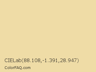 CIELab 88.108,-1.391,28.947 Color is a light orange color and the nearest color is Double Colonial White #eee3ad. Hex code #efdca6 and RGB value is rgb(239,220,166). In RGB color space, this color is composed of 94% red, 86% green, 65% blue, In CMYK color space, this color is composed of 0% cyan, 8% magenta, 31% yellow , 6% black , In HSL color space, this color has a hue angle of 44° , 70% saturation and 79% lightness.