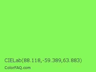 CIELab 88.118,-59.389,63.883 Color is a light green color and the nearest color is Kiwi #8ee53f. Hex code #86f759 and RGB value is rgb(134,247,89). In RGB color space, this color is composed of 53% red, 97% green, 35% blue, In CMYK color space, this color is composed of 46% cyan, 0% magenta, 64% yellow , 3% black , In HSL color space, this color has a hue angle of 103° , 91% saturation and 66% lightness.