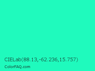 CIELab 88.13,-62.236,15.757 Color is a normal green color and the nearest color is Turquoise PWG #30d5c8. Hex code #1ffabd and RGB value is rgb(31,250,189). In RGB color space, this color is composed of 12% red, 98% green, 74% blue, In CMYK color space, this color is composed of 88% cyan, 0% magenta, 24% yellow , 2% black , In HSL color space, this color has a hue angle of 163° , 96% saturation and 55% lightness.