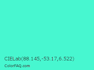 CIELab 88.145,-53.17,6.522 Color is a light cyan color and the nearest color is Turquoise #40e0d0. Hex code #47f7cf and RGB value is rgb(71,247,207). In RGB color space, this color is composed of 28% red, 97% green, 81% blue, In CMYK color space, this color is composed of 71% cyan, 0% magenta, 16% yellow , 3% black , In HSL color space, this color has a hue angle of 166° , 92% saturation and 62% lightness.