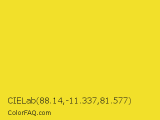 CIELab 88.14,-11.337,81.577 Color is a normal yellow color and the nearest color is Dandelion #f0e130. Hex code #f2e02a and RGB value is rgb(242,224,42). In RGB color space, this color is composed of 95% red, 88% green, 16% blue, In CMYK color space, this color is composed of 0% cyan, 7% magenta, 83% yellow , 5% black , In HSL color space, this color has a hue angle of 55° , 88% saturation and 56% lightness.