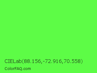 CIELab 88.156,-72.916,70.558 Color is a light green color and the nearest color is Screamin Green #66ff66. Hex code #5dfc46 and RGB value is rgb(93,252,70). In RGB color space, this color is composed of 36% red, 99% green, 27% blue, In CMYK color space, this color is composed of 63% cyan, 0% magenta, 72% yellow , 1% black , In HSL color space, this color has a hue angle of 112° , 97% saturation and 63% lightness.