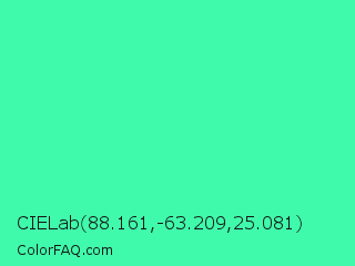 CIELab 88.161,-63.209,25.081 Color is a light green color and the nearest color is Eucalyptus #44d7a8. Hex code #40faab and RGB value is rgb(64,250,171). In RGB color space, this color is composed of 25% red, 98% green, 67% blue, In CMYK color space, this color is composed of 74% cyan, 0% magenta, 32% yellow , 2% black , In HSL color space, this color has a hue angle of 155° , 95% saturation and 62% lightness.