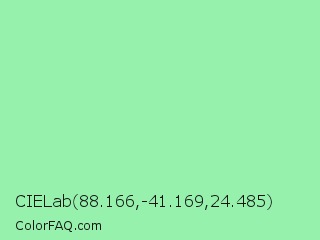 CIELab 88.166,-41.169,24.485 Color is a light green color and the nearest color is Teal Deer #99e6b3. Hex code #96f1ad and RGB value is rgb(150,241,173). In RGB color space, this color is composed of 59% red, 95% green, 68% blue, In CMYK color space, this color is composed of 38% cyan, 0% magenta, 28% yellow , 5% black , In HSL color space, this color has a hue angle of 135° , 76% saturation and 77% lightness.