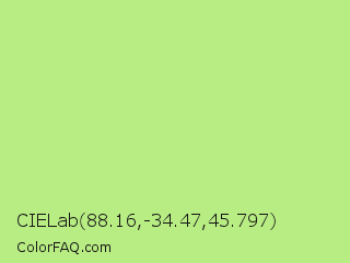 CIELab 88.16,-34.47,45.797 Color is a light green color and the nearest color is Sulu #c1f07c. Hex code #b8ed83 and RGB value is rgb(184,237,131). In RGB color space, this color is composed of 72% red, 93% green, 51% blue, In CMYK color space, this color is composed of 22% cyan, 0% magenta, 45% yellow , 7% black , In HSL color space, this color has a hue angle of 90° , 75% saturation and 72% lightness.