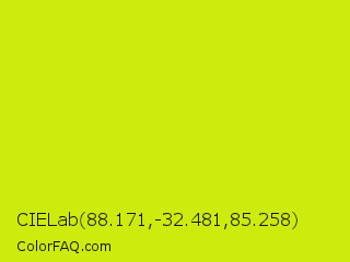 CIELab 88.171,-32.481,85.258 Color is a normal yellow color and the nearest color is Las Palmas #c6e610. Hex code #cdeb0c and RGB value is rgb(205,235,12). In RGB color space, this color is composed of 80% red, 92% green, 5% blue, In CMYK color space, this color is composed of 13% cyan, 0% magenta, 95% yellow , 8% black , In HSL color space, this color has a hue angle of 68° , 90% saturation and 48% lightness.