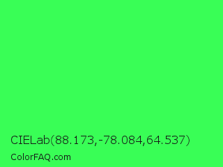 CIELab 88.173,-78.084,64.537 Color is a light green color and the nearest color is Screamin Green #66ff66. Hex code #39fe56 and RGB value is rgb(57,254,86). In RGB color space, this color is composed of 22% red, 100% green, 34% blue, In CMYK color space, this color is composed of 78% cyan, 0% magenta, 66% yellow , 0% black , In HSL color space, this color has a hue angle of 129° , 99% saturation and 61% lightness.