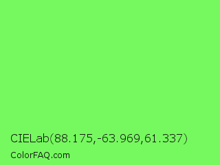 CIELab 88.175,-63.969,61.337 Color is a light green color and the nearest color is Screamin Green #66ff66. Hex code #76f95f and RGB value is rgb(118,249,95). In RGB color space, this color is composed of 46% red, 98% green, 37% blue, In CMYK color space, this color is composed of 53% cyan, 0% magenta, 62% yellow , 2% black , In HSL color space, this color has a hue angle of 111° , 93% saturation and 67% lightness.