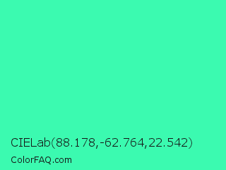 CIELab 88.178,-62.764,22.542 Color is a light green color and the nearest color is Eucalyptus #44d7a8. Hex code #3bfab0 and RGB value is rgb(59,250,176). In RGB color space, this color is composed of 23% red, 98% green, 69% blue, In CMYK color space, this color is composed of 76% cyan, 0% magenta, 30% yellow , 2% black , In HSL color space, this color has a hue angle of 157° , 95% saturation and 61% lightness.
