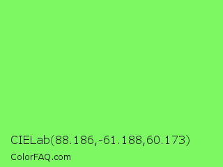 CIELab 88.186,-61.188,60.173 Color is a light green color and the nearest color is Screamin Green #66ff66. Hex code #7ef862 and RGB value is rgb(126,248,98). In RGB color space, this color is composed of 49% red, 97% green, 38% blue, In CMYK color space, this color is composed of 49% cyan, 0% magenta, 60% yellow , 3% black , In HSL color space, this color has a hue angle of 109° , 91% saturation and 68% lightness.
