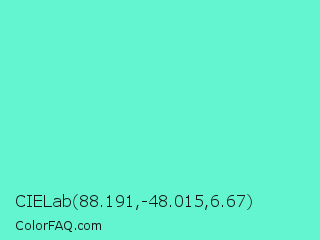 CIELab 88.191,-48.015,6.67 Color is a light cyan color and the nearest color is Aquamarine #7fffd4. Hex code #63f5cf and RGB value is rgb(99,245,207). In RGB color space, this color is composed of 39% red, 96% green, 81% blue, In CMYK color space, this color is composed of 60% cyan, 0% magenta, 16% yellow , 4% black , In HSL color space, this color has a hue angle of 164° , 88% saturation and 67% lightness.