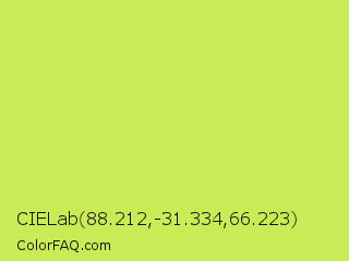 CIELab 88.212,-31.334,66.223 Color is a light lime color and the nearest color is Maximum Green Yellow #d9e650. Hex code #c9eb56 and RGB value is rgb(201,235,86). In RGB color space, this color is composed of 79% red, 92% green, 34% blue, In CMYK color space, this color is composed of 14% cyan, 0% magenta, 63% yellow , 8% black , In HSL color space, this color has a hue angle of 74° , 79% saturation and 63% lightness.