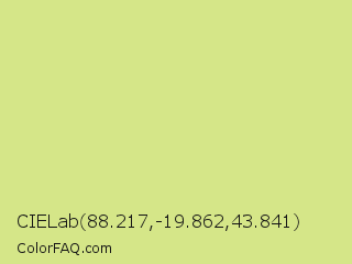 CIELab 88.217,-19.862,43.841 Color is a light lime color and the nearest color is Medium Spring Bud #c9dc87. Hex code #d5e688 and RGB value is rgb(213,230,136). In RGB color space, this color is composed of 84% red, 90% green, 53% blue, In CMYK color space, this color is composed of 7% cyan, 0% magenta, 41% yellow , 10% black , In HSL color space, this color has a hue angle of 71° , 65% saturation and 72% lightness.