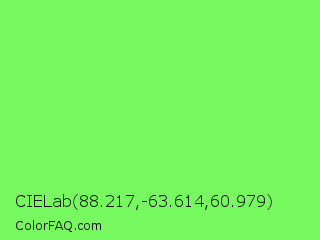CIELab 88.217,-63.614,60.979 Color is a light green color and the nearest color is Screamin Green #66ff66. Hex code #77f960 and RGB value is rgb(119,249,96). In RGB color space, this color is composed of 47% red, 98% green, 38% blue, In CMYK color space, this color is composed of 52% cyan, 0% magenta, 61% yellow , 2% black , In HSL color space, this color has a hue angle of 111° , 93% saturation and 68% lightness.